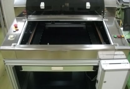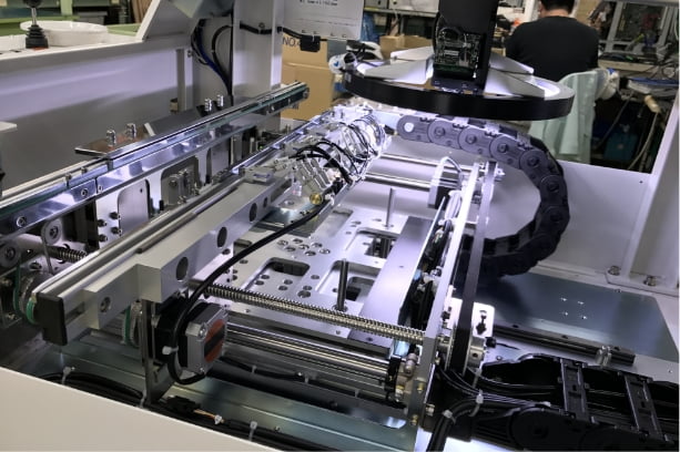 加工機の出口にラインカメラユニットを組付け、加工機から搬出されるフレームの流れに合わせて撮影し、穴位置・径・